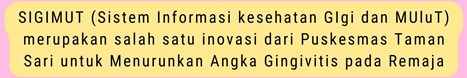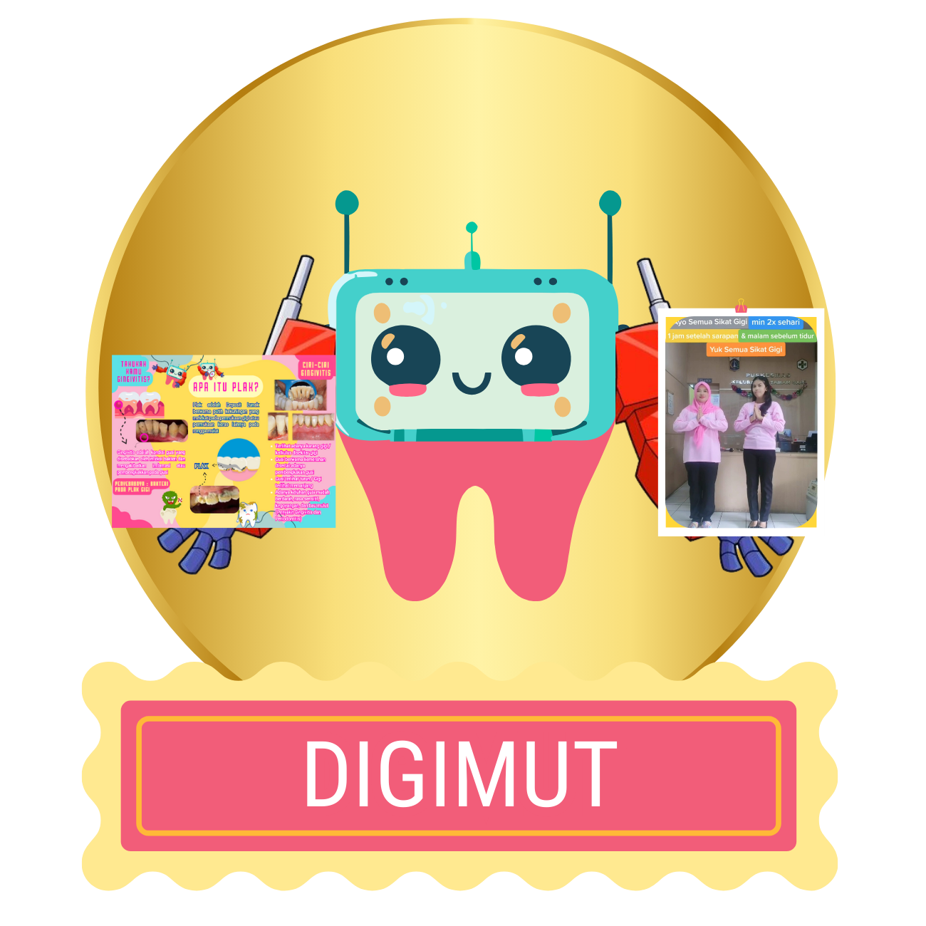 DIGIMUT (pembuatan meDIa kie tentang kesehatan GIgi dan MUluT) berisi informasi tentang kesehatan gigi dan mulut yang dibuat dengan kreatif dan inovatif baik online maupun offline untuk meningkatkan pengetahuan remaja sehingga remaja menjadi lebih peduli menjaga kesehatan gigi dan mulutnya.